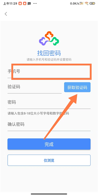 2、在找回密碼界面,輸入手機號后點擊獲取驗證碼。