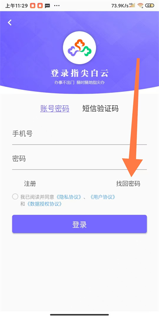 1、在指尖白云app登錄頁面,點擊找回密碼選項,進入找回密碼界面。
