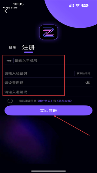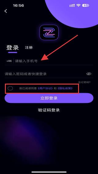 3、輸入手機號碼,勾選我已閱讀同意用戶協(xié)議和隱私政策,再輸入賬號密碼,點擊立即登錄。