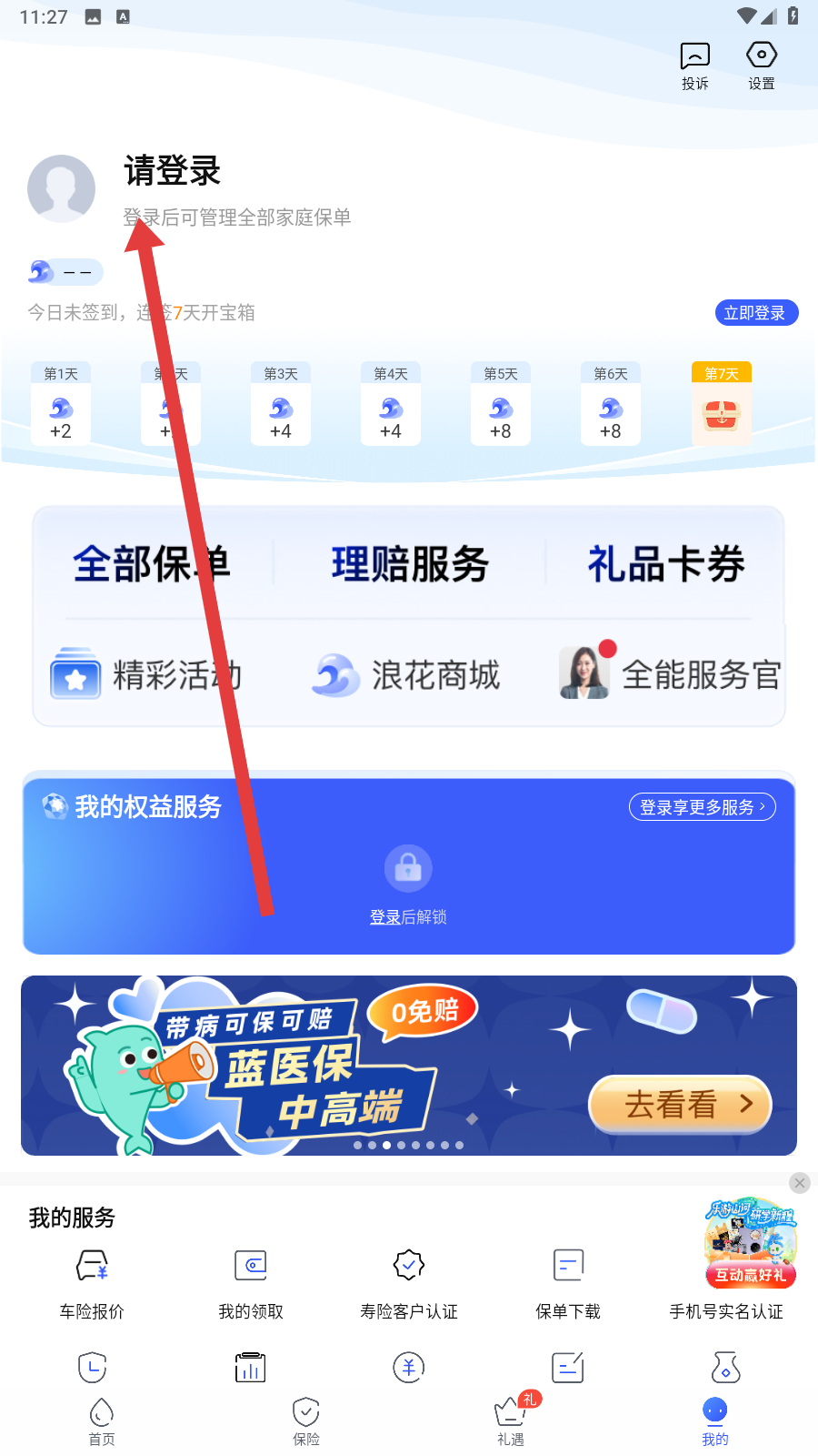 1、在太平洋保險(xiǎn)app中我的個(gè)人主頁點(diǎn)擊上方的請登錄按鈕,可以開始執(zhí)行登錄操作。