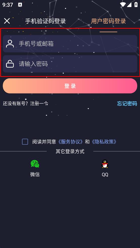 3、在用戶密碼登錄界面,依次在“手機(jī)號(hào)或郵箱”輸入框輸入賬號(hào),在“請(qǐng)輸入密碼”輸入框輸入密碼。