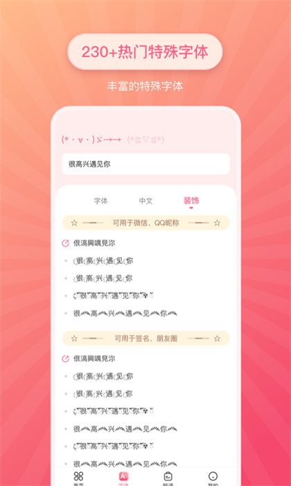 特殊文字是一款集成了各式字體、顏文字符號(hào)的應(yīng)用,您可以在應(yīng)用中選擇任意字體在社交平臺(tái)上使用,超酷、超可愛、超個(gè)性的字體、顏文字和特殊符號(hào),可以在任何app中使用!