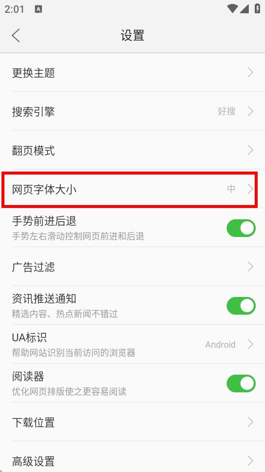 3、在設(shè)置頁(yè)面里,找到網(wǎng)頁(yè)字體大小選項(xiàng)并點(diǎn)擊。