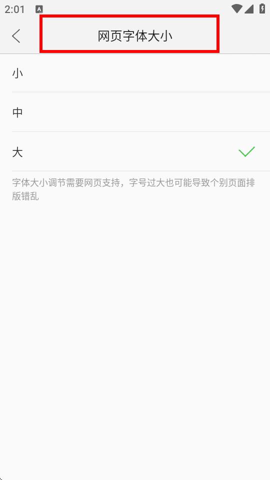 4、在網(wǎng)頁(yè)字體大小設(shè)置界面,選擇小,中,大其中一種合適的字體大小即可。