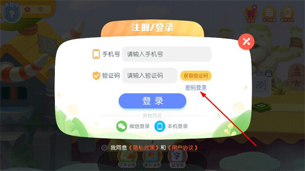 2、在注冊(cè)/登錄窗口中,點(diǎn)擊下方密碼登錄選項(xiàng)。