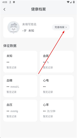 3、在健康檔案頁面,點(diǎn)擊完善檔案按鈕。