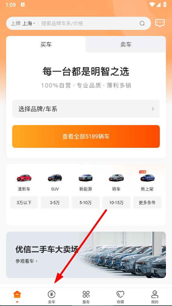 1、打開優(yōu)信二手車app,在首頁下方點(diǎn)擊賣車圖標(biāo),進(jìn)入賣車信息填寫頁面。