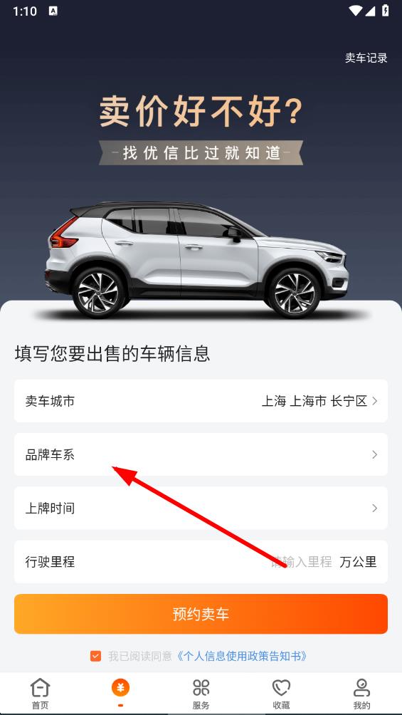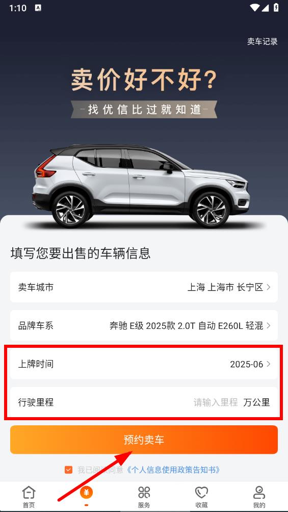 4、在賣車信息填寫頁面,繼續(xù)填寫上牌時(shí)間、行駛里程等車輛信息,確認(rèn)無誤后,點(diǎn)擊預(yù)約賣車按鈕,即可完成賣車預(yù)約操作。
