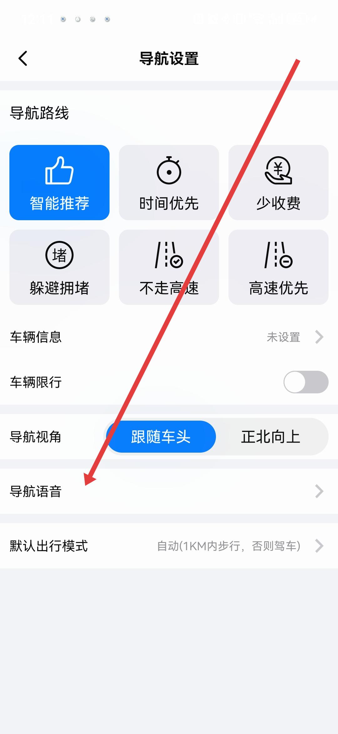2、在導(dǎo)航設(shè)置的界面,找到倒數(shù)第二個(gè)欄目并點(diǎn)擊導(dǎo)航的語(yǔ)音選項(xiàng),進(jìn)入語(yǔ)音播報(bào)參數(shù)調(diào)整頁(yè)。