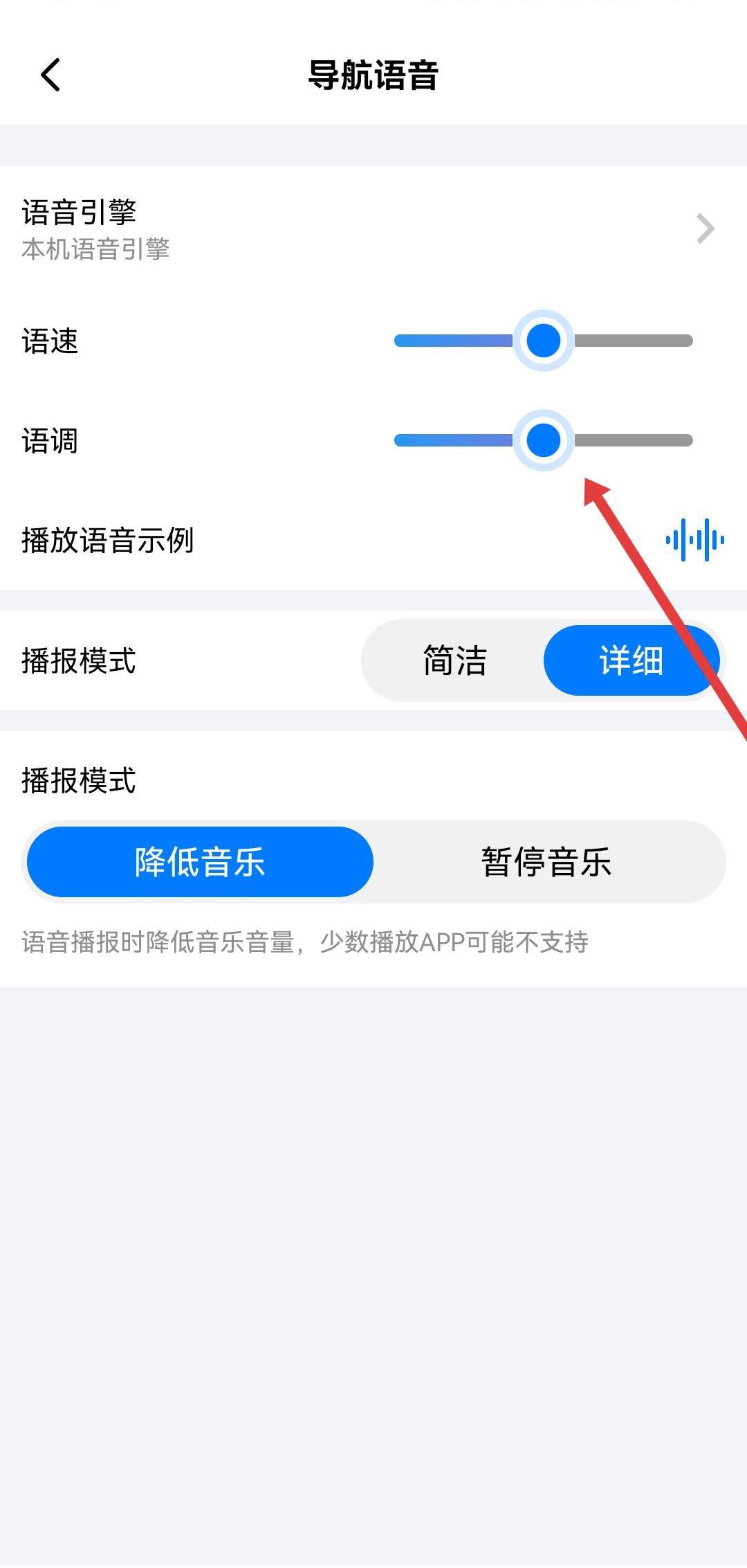 3、在導(dǎo)航語(yǔ)音頁(yè)面,拖動(dòng)語(yǔ)速、語(yǔ)調(diào)滑塊調(diào)整聲音節(jié)奏,選擇播報(bào)模式詳細(xì)/簡(jiǎn)潔,還可設(shè)置語(yǔ)音引擎、音樂(lè)交互方式,完成個(gè)性化語(yǔ)音播報(bào)配置。