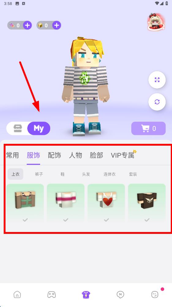 2、在服裝更換界面中,點(diǎn)擊左側(cè)的My按鈕,下方會(huì)出現(xiàn)分類標(biāo)簽,點(diǎn)擊對(duì)應(yīng)標(biāo)簽,從已擁有的服裝中挑選更換。