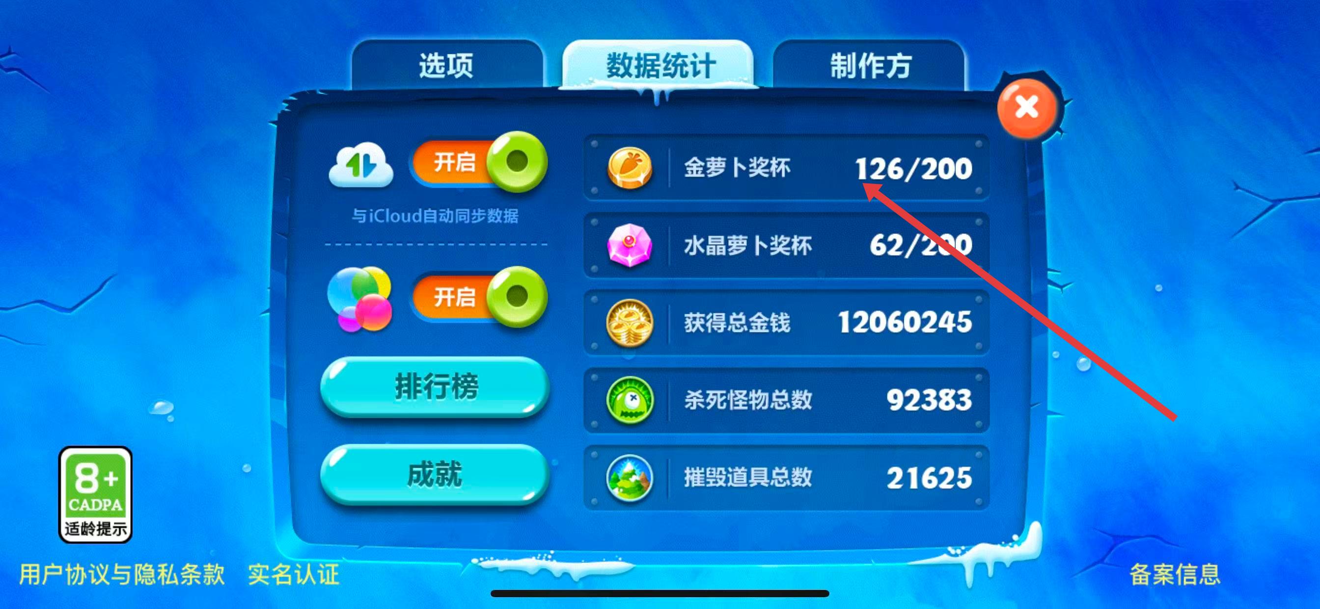 4、在數(shù)據(jù)統(tǒng)計(jì)界面中,找到金蘿卜獎(jiǎng)杯選項(xiàng),其右側(cè)顯示的數(shù)字,前面的數(shù)值代表已獲得的金蘿卜數(shù)量,斜杠后面的數(shù)值代表游戲中總的金蘿卜數(shù)量。