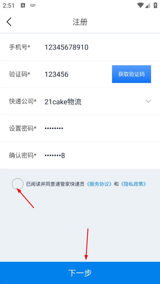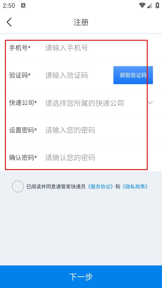 4、勾選“已閱讀并同意遞管家快遞員服務(wù)協(xié)議和隱私政策,點擊“下一步”,按照后續(xù)提示完成注冊。