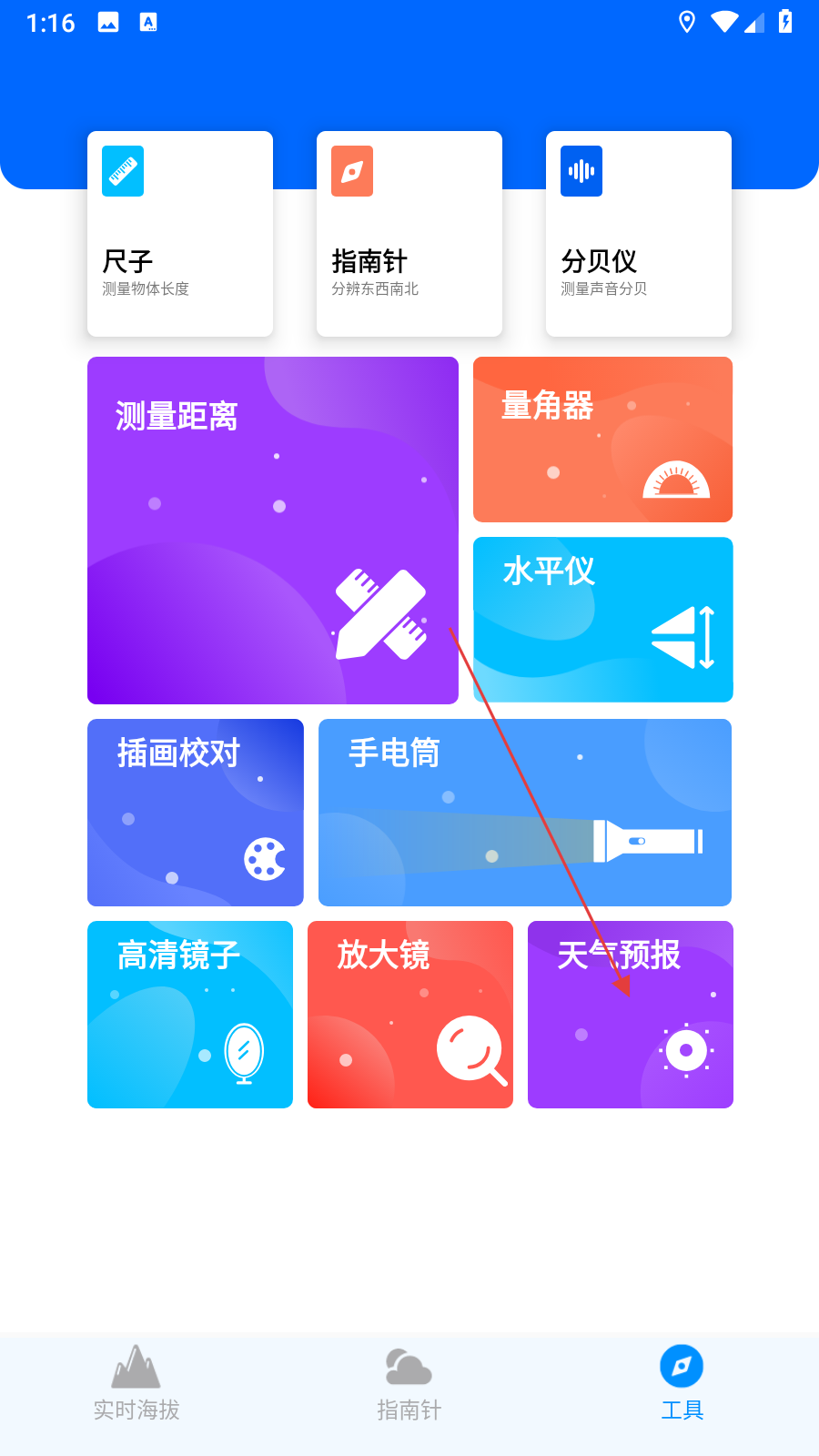 1、打開GPS海拔測(cè)量?jī)x應(yīng)用,在工具界面中找到并點(diǎn)擊天氣預(yù)報(bào)選項(xiàng),進(jìn)入天氣預(yù)報(bào)頁(yè)面。