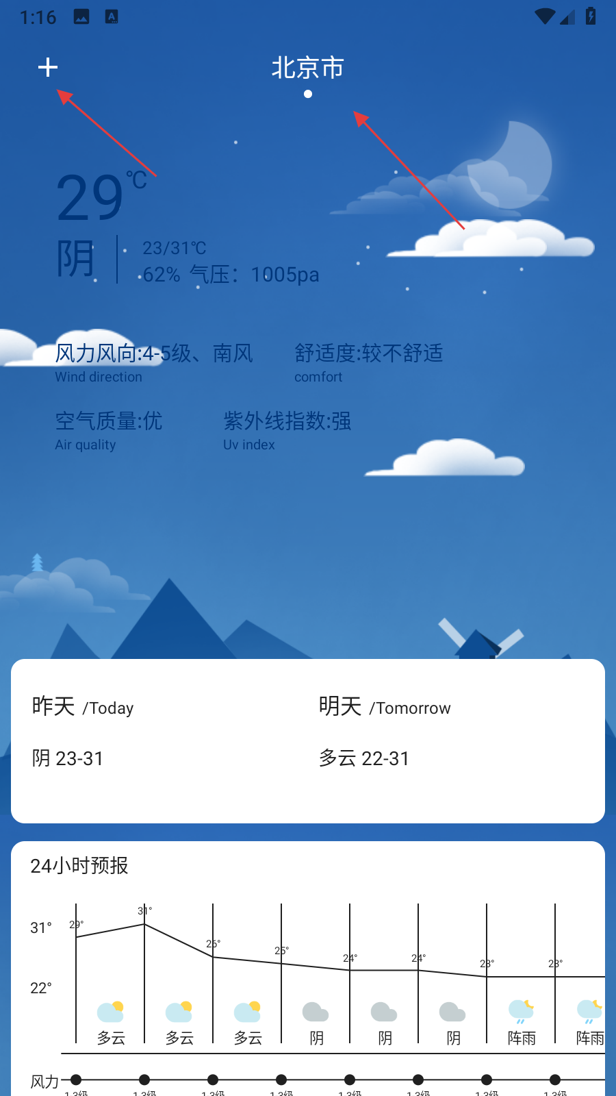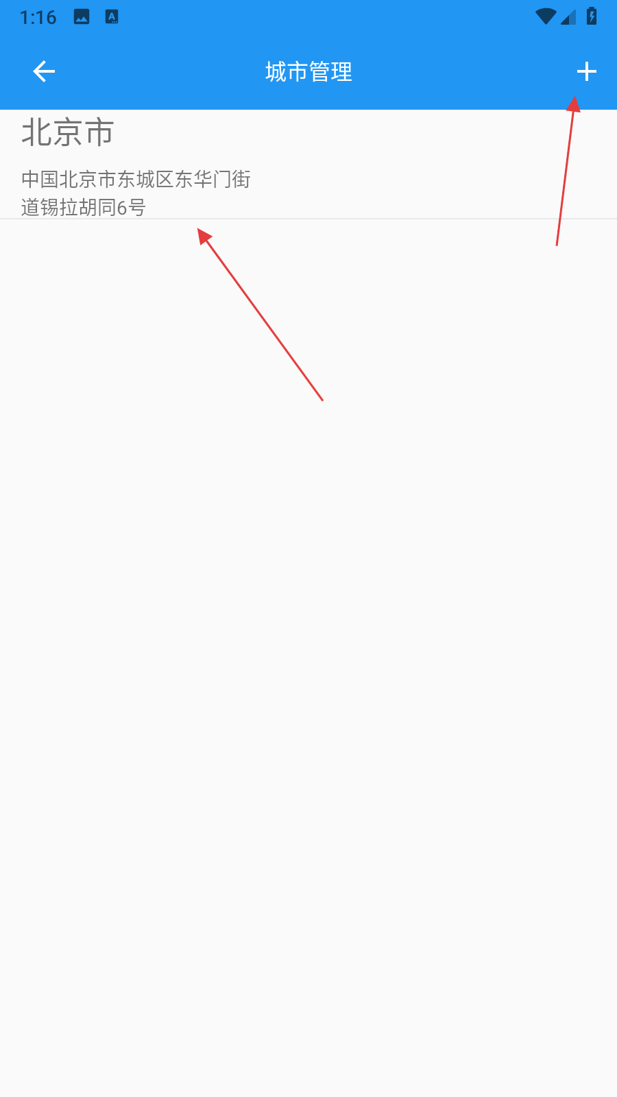 3、若需查看其他城市的天氣預(yù)報(bào),點(diǎn)擊頁(yè)面左上角的+號(hào),進(jìn)入城市管理界面,或者在城市管理界面點(diǎn)擊右上角+號(hào)。