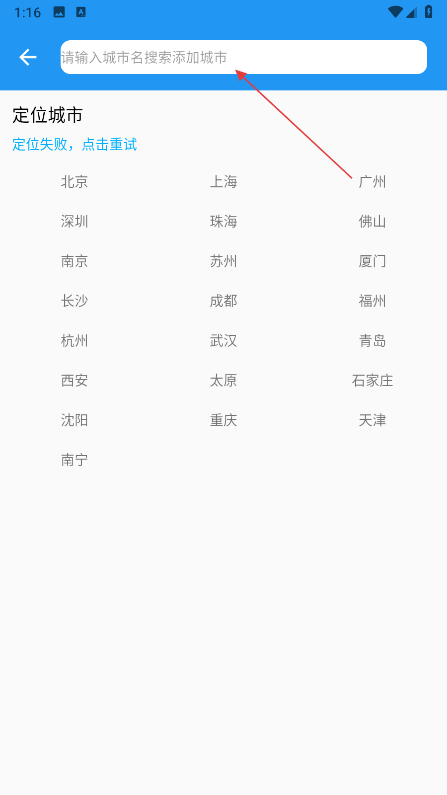 4、通過搜索框輸入城市名或從推薦城市列表中選擇目標(biāo)城市,添加后返回天氣預(yù)報(bào)頁(yè)面即可查看該城市天氣。