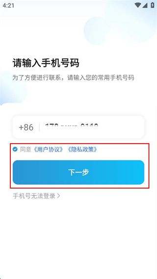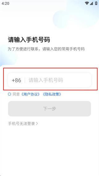 1、打開該軟件進入請輸入手機號碼頁面,在對應輸入框填寫常用手機號。