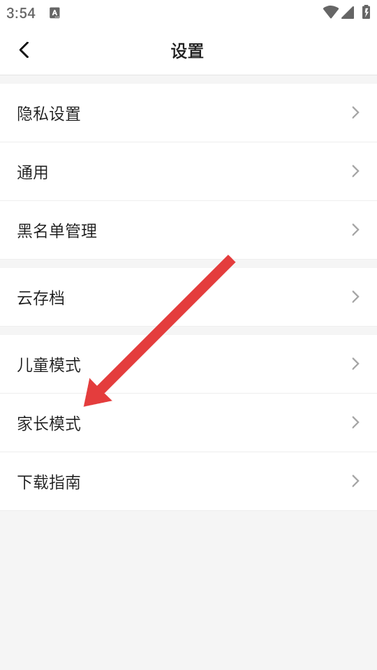 3、在設(shè)置頁面,點(diǎn)擊家長模式選項(xiàng),進(jìn)入設(shè)置家長守護(hù)模式頁面。
