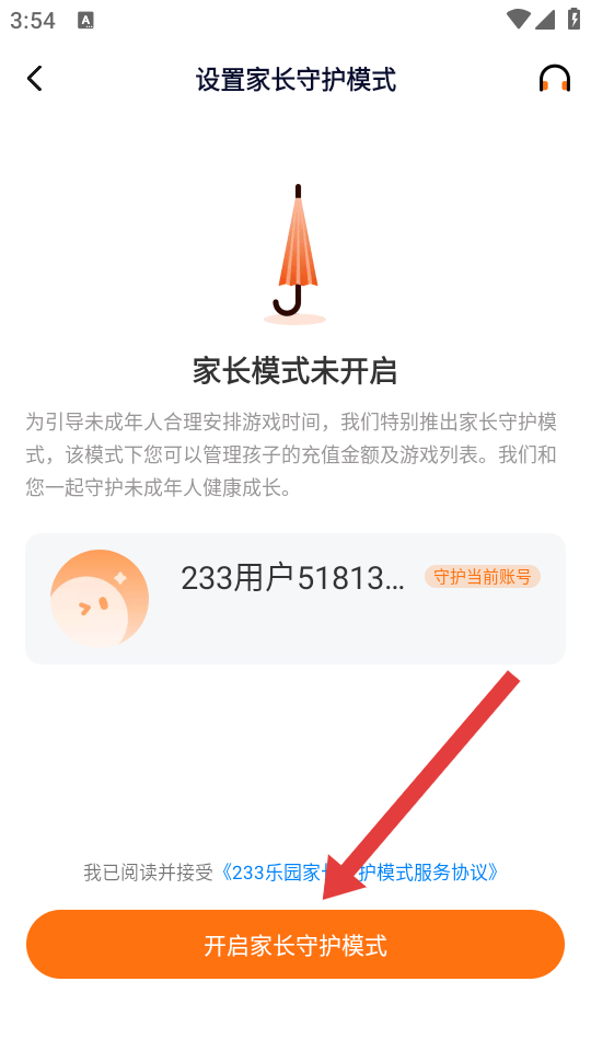 4、在設(shè)置家長守護(hù)模式頁面,點(diǎn)擊開啟家長守護(hù)模式按鈕,完成家長模式設(shè)置。