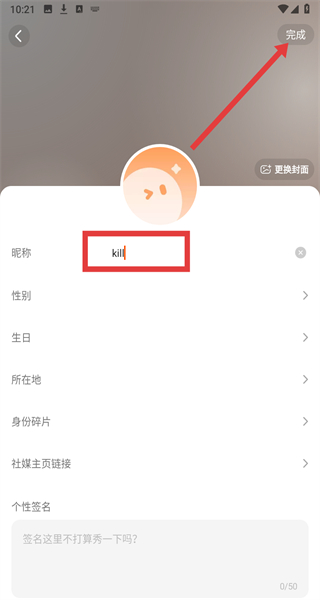 4、在昵稱輸入框中輸入新昵稱后,點(diǎn)擊右上角的完成按鈕,即可完成修改。