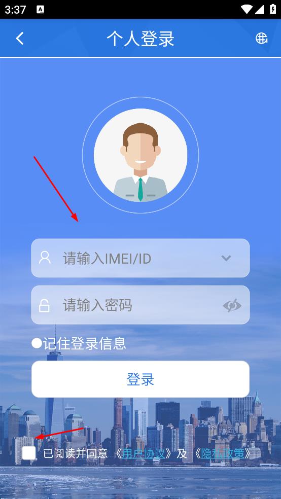 3、在“請(qǐng)輸入IMEI/ID”欄填入對(duì)應(yīng)內(nèi)容,在“請(qǐng)輸入密碼”欄輸入密碼,點(diǎn)擊“登錄”,完成賬號(hào)登錄 。
