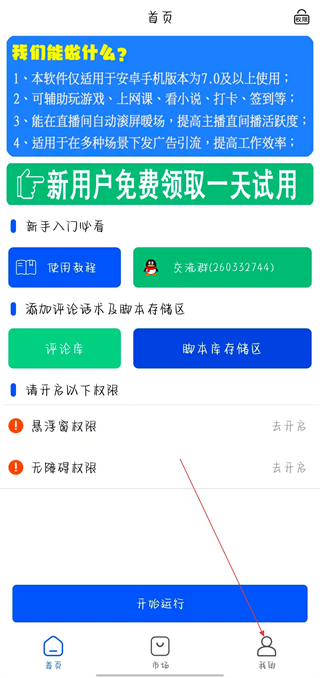 1、打開(kāi)粒可辛自動(dòng)點(diǎn)擊器應(yīng)用,點(diǎn)擊底部導(dǎo)航欄最右側(cè)的我的,進(jìn)入個(gè)人中心頁(yè)面。