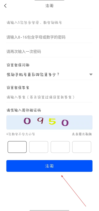 4、在注冊(cè)頁(yè)面,依次輸入賬號(hào)、密碼、再次輸入密碼、設(shè)置密保問(wèn)題及答案,然后輸入圖形驗(yàn)證碼,最后點(diǎn)擊注冊(cè)按鈕。