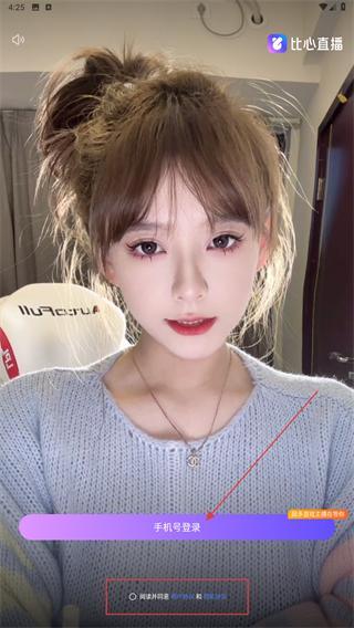 1、打開比心直播APP,進(jìn)入時(shí)點(diǎn)擊手機(jī)號登錄的按鈕。