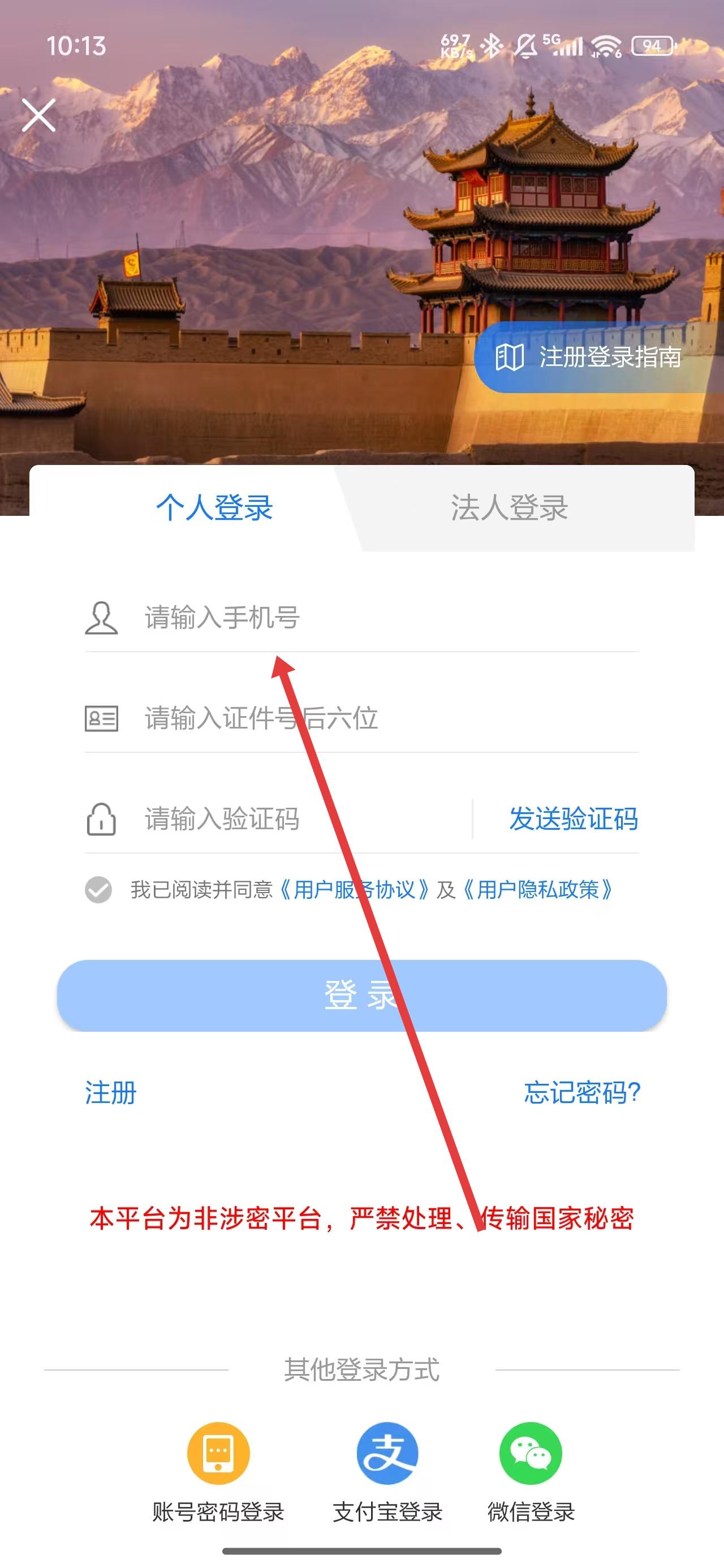 3、在登錄頁(yè)面中,點(diǎn)擊輸入框依次輸入登錄相關(guān)信息完成登錄操作。