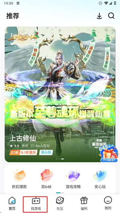 1、進(jìn)入軟件的首頁能看到平臺推薦的一些熱門游戲,我們還可以去找游戲這里找尋更多的作品;