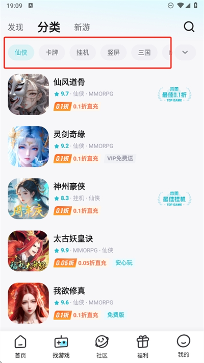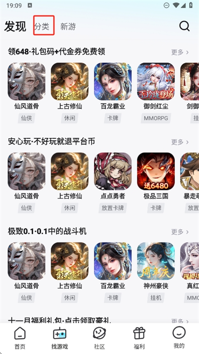 2、進(jìn)入發(fā)現(xiàn)頁面找尋游戲時,可以選擇分類查看更多的游戲并進(jìn)行了解和下載非常簡單;