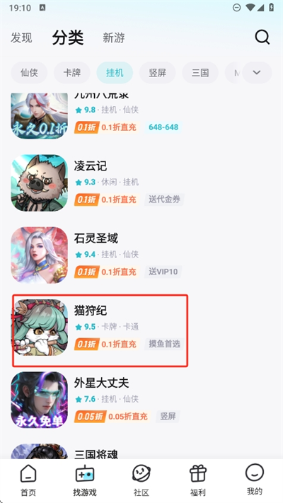 4、比如我們想要看看掛機(jī)玩法下的游戲,我們以貓狩紀(jì)這個游戲為主點擊查看更詳細(xì)的內(nèi)容;