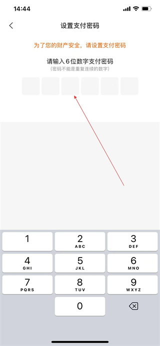 5、在密碼設(shè)置頁面輸入6位數(shù)字支付密碼,完成支付密碼的設(shè)置。