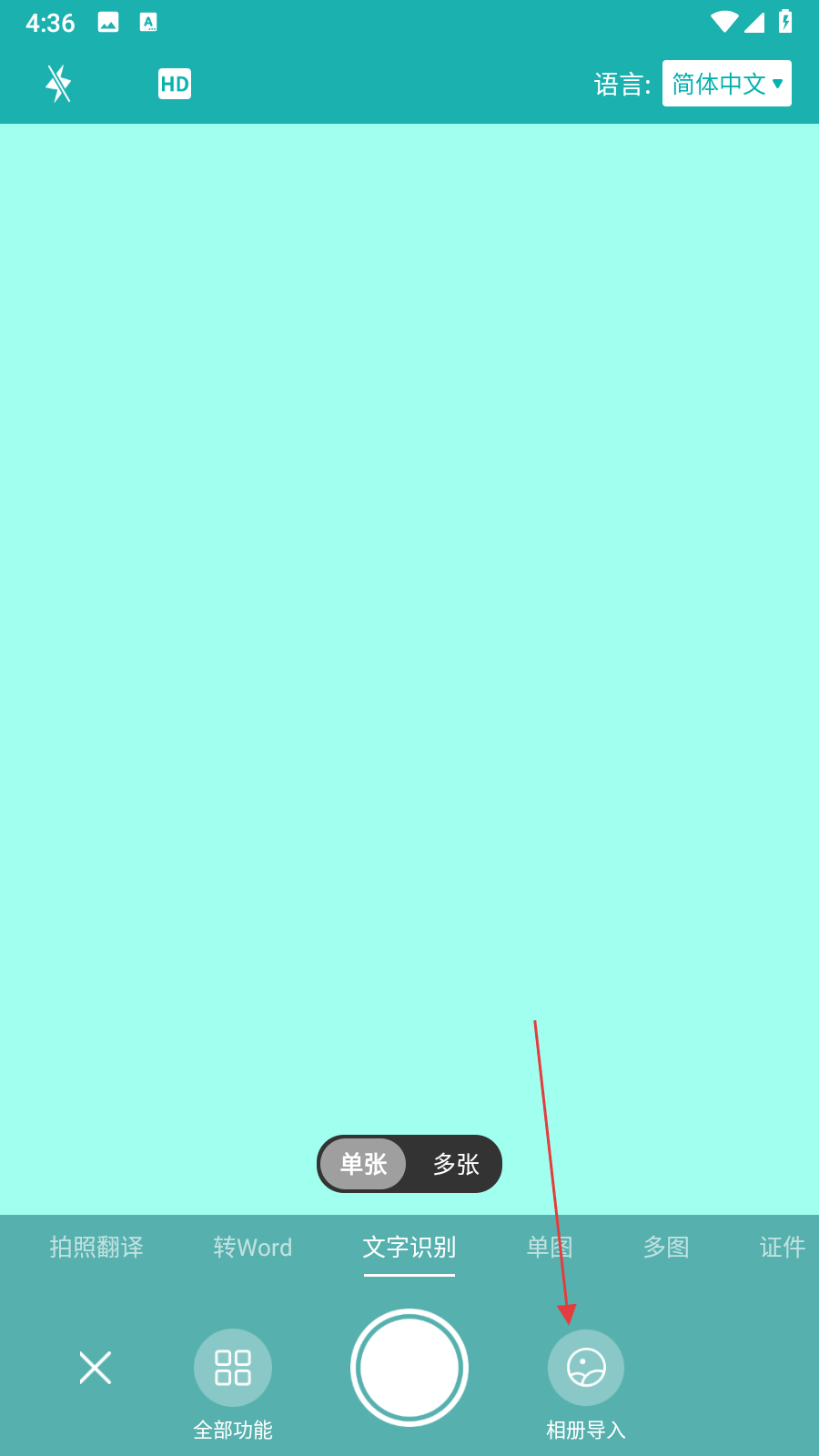 2、在文字識別操作界面,點(diǎn)擊相冊導(dǎo)入,從手機(jī)相冊中選擇需要進(jìn)行文字識別的圖片。