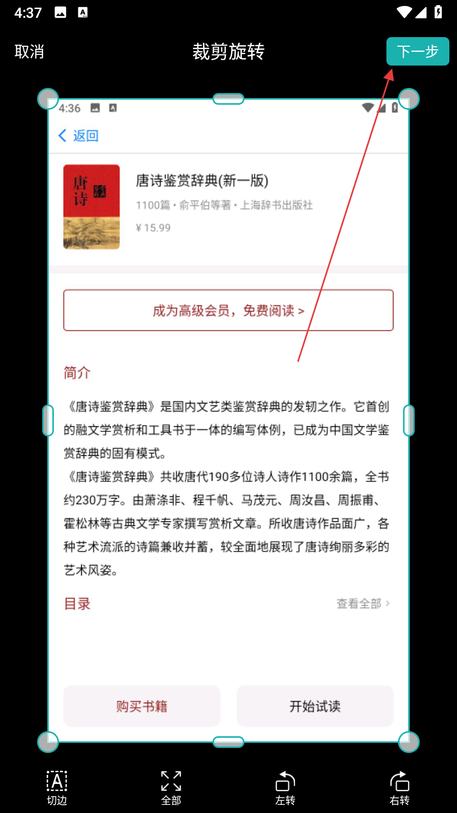 3、在裁剪旋轉(zhuǎn)頁面,調(diào)整圖片的裁剪框,將需要識別的文字區(qū)域框選出來,調(diào)整完畢后點(diǎn)擊右上角下一步。