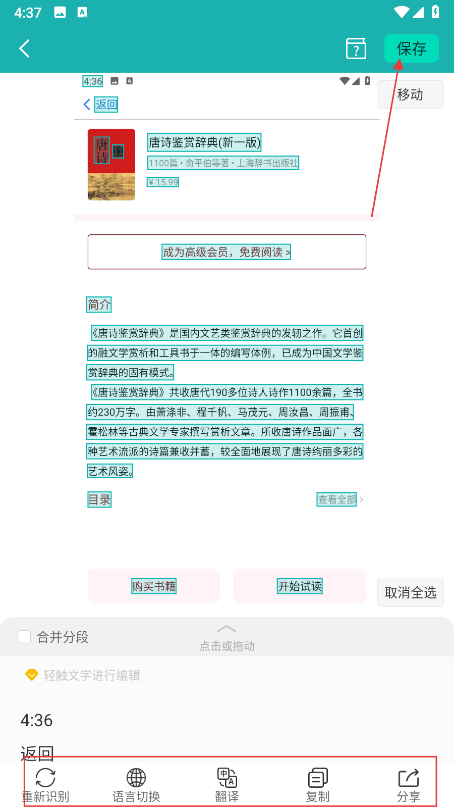 4、在文字識別處理頁面,對識別出的文字進(jìn)行編輯、復(fù)制、翻譯等操作,最后點(diǎn)擊右上角保存。