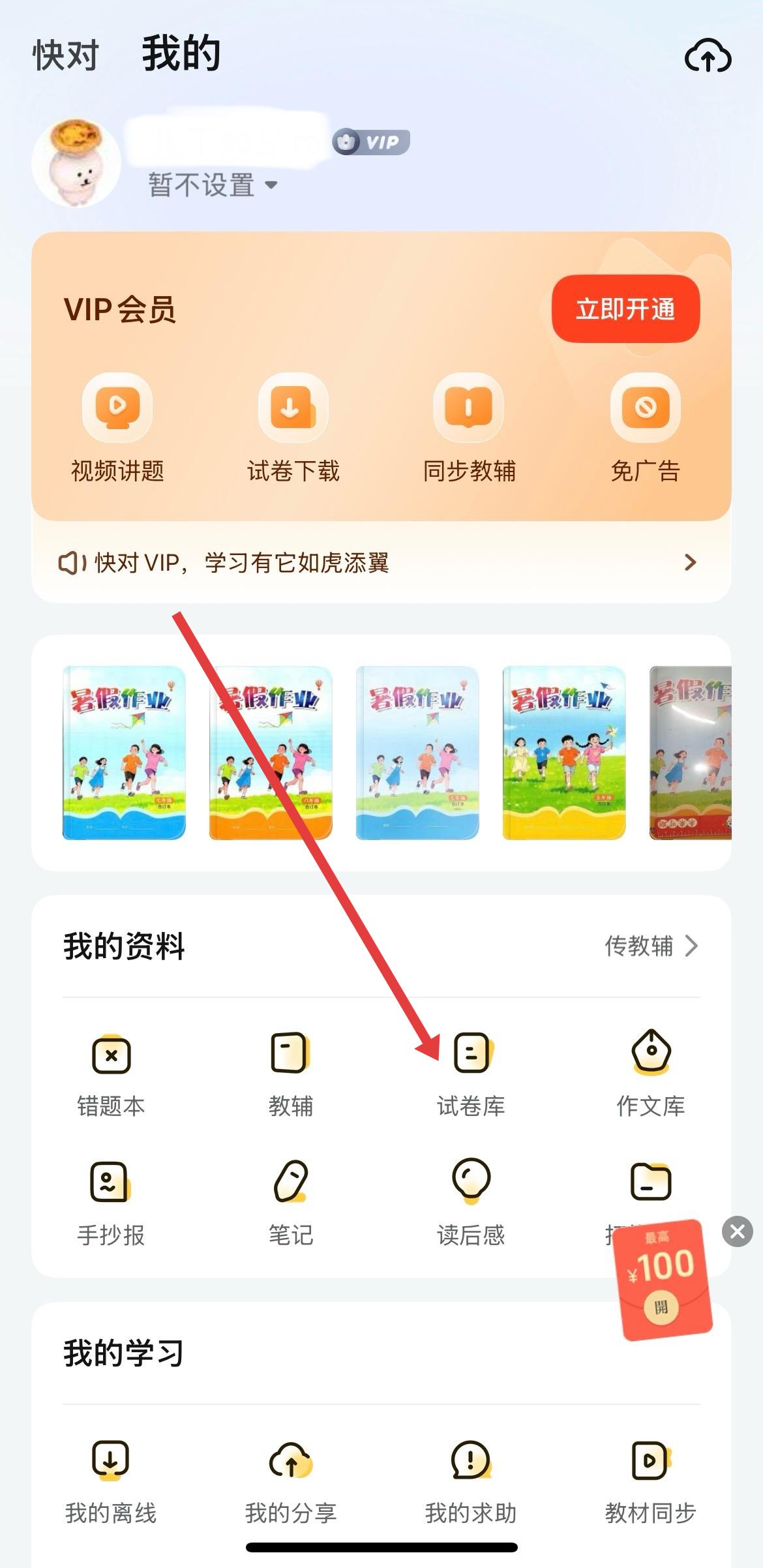 1、進(jìn)入快對(duì)作業(yè)app,點(diǎn)擊進(jìn)入我的頁面,找到我的資料區(qū)域里的試卷庫,點(diǎn)擊進(jìn)入。
