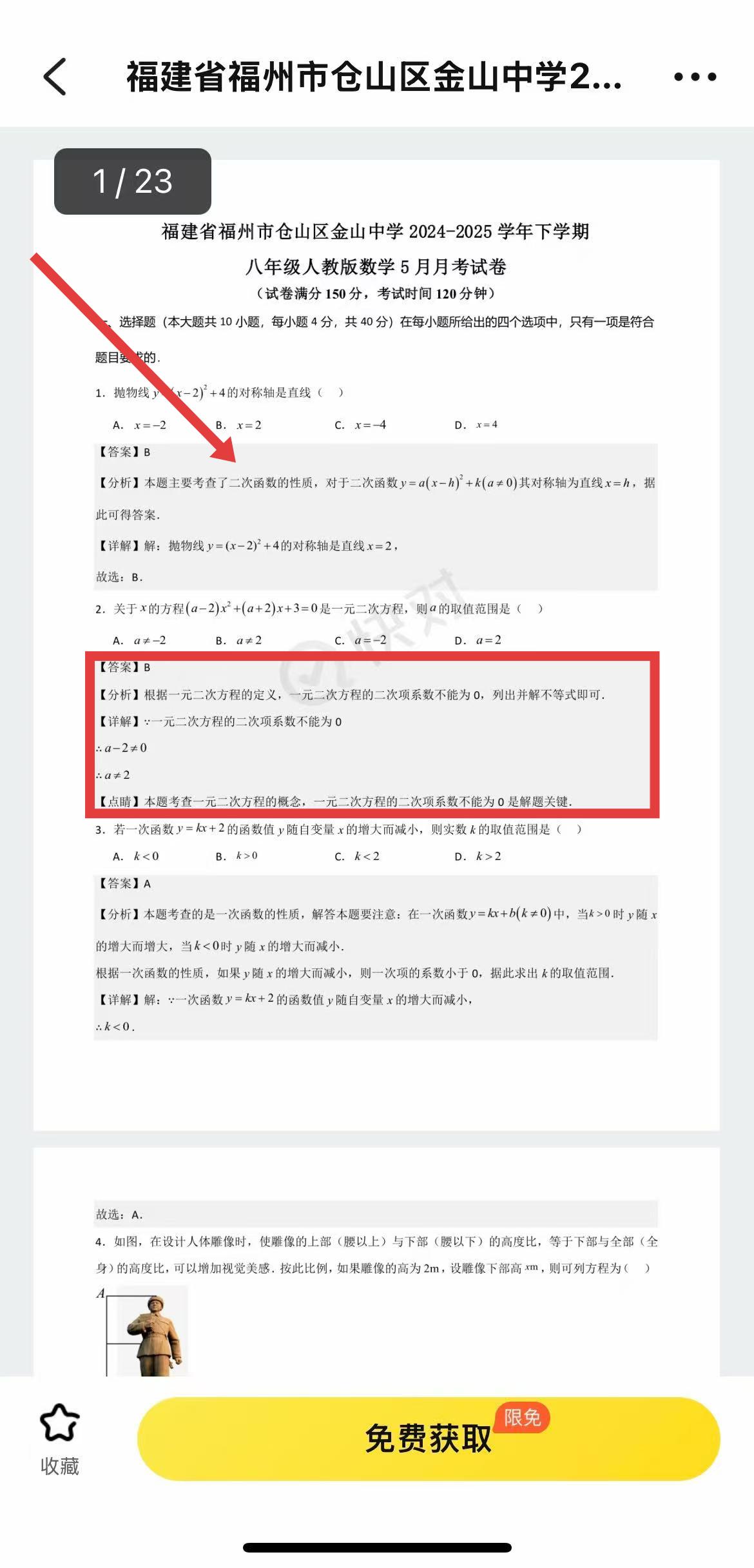 3、找到你需要的試卷之后,打開試卷,就可以查看題目以及題目下方的答案及解析內(nèi)容。
