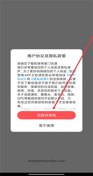 1、打開掌門優(yōu)課APP,點(diǎn)擊同意并使用按鈕,確認(rèn)用戶協(xié)議及隱私政策,進(jìn)入登錄界面。