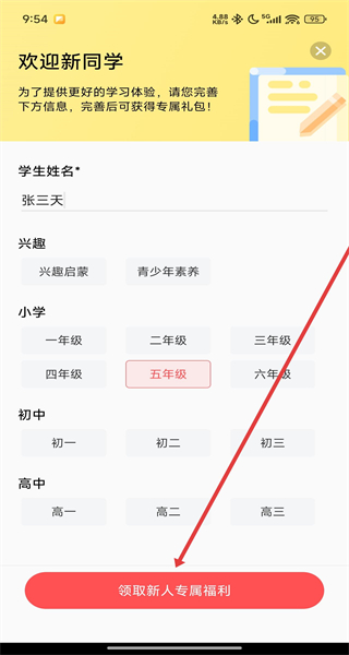 4、在“歡迎新同學(xué)”界面,完善學(xué)生信息后,點(diǎn)擊領(lǐng)取新人專屬福利按鈕即可進(jìn)入首頁。