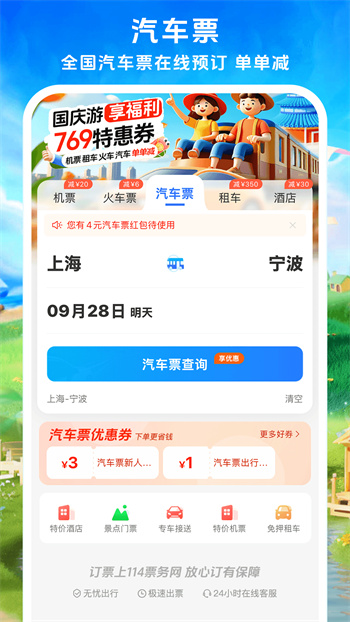 114票務機票火車票汽車票APP提供專業(yè)的酒店預訂、機票、火車票、汽車票等全方位的旅行產(chǎn)品預訂服務。與中國道路運輸協(xié)會和全國站場工委共建,為全國各地的公路出行旅客提供詳細的汽車票在線查詢、預訂服務。