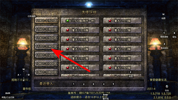 2、在選擇區(qū)組頁(yè)面,點(diǎn)擊左側(cè)的區(qū)組分類,如11201-11400區(qū)。