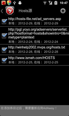 廣告快走開(AdAway)是一個開源的Android平臺手機軟件廣告攔截工具,通過修改手機的HOSTS文件來達到有效攔截的功能。是Android平臺上攔截廣告的利器!有點像瀏覽器上得adblock應(yīng)用一樣,通過下載開源的列表來進行屏蔽軟件的廣告的功能。AdAway對于常規(guī)軟件廣告完全可以攔截下來,不過目前很多軟件都做成了廣告墻,需要積分就能去除,這類的廣告用它還是沒辦法攔截的。