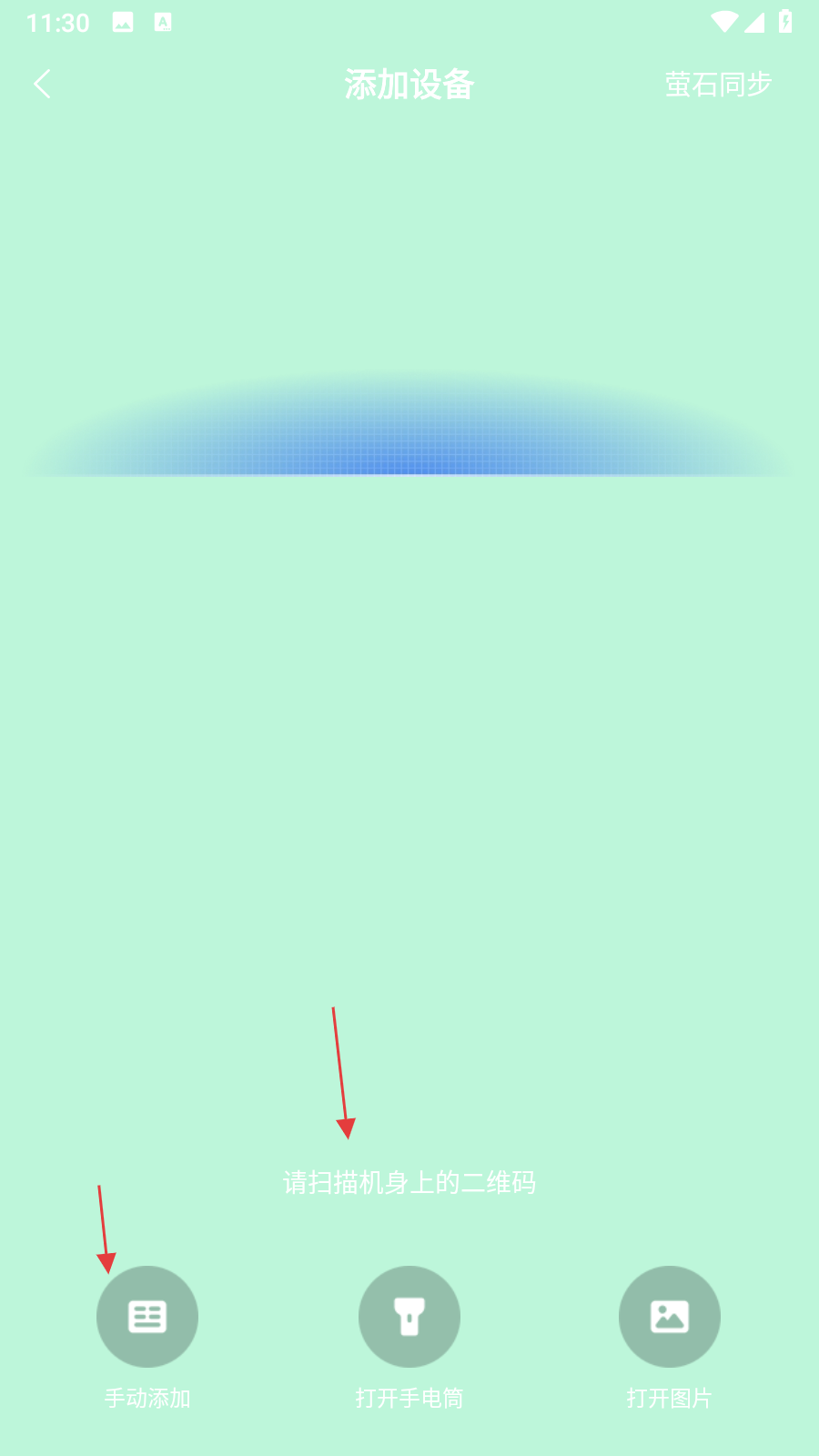 3、進入掃碼添加頁面后,掃描機身上的二維碼即可,若需手動添加,點擊左下角手動添加按鈕。