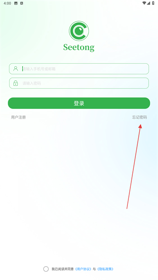 1、啟動手機(jī)遠(yuǎn)程監(jiān)控的APP,進(jìn)入時(shí)點(diǎn)擊右側(cè)忘記密碼。