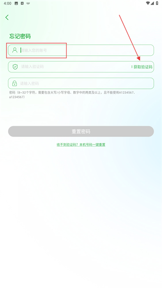 2、進(jìn)入忘記密碼的界面內(nèi),輸入手機(jī)號再點(diǎn)擊獲取驗(yàn)證碼。