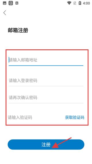 3、輸入郵箱地址、登錄密碼、驗證碼,點擊注冊,即可完成賬號注冊。