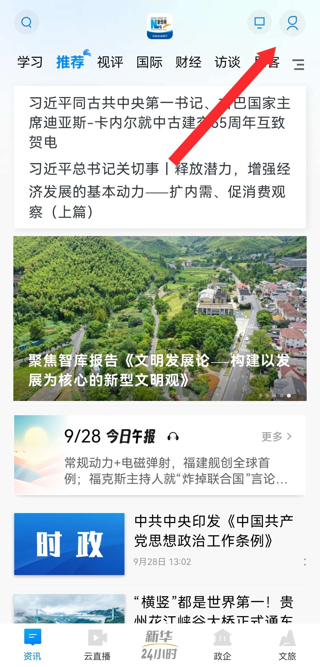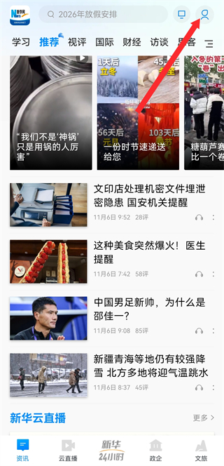 1、打開新華網(wǎng)APP,點(diǎn)擊右上角的個(gè)人頭像圖標(biāo),進(jìn)入個(gè)人頁面。