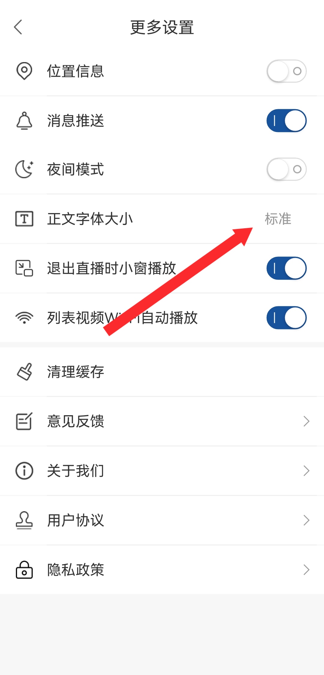 3、在設(shè)置界面,點(diǎn)擊正文字體大小,進(jìn)入字體大小設(shè)置頁面。