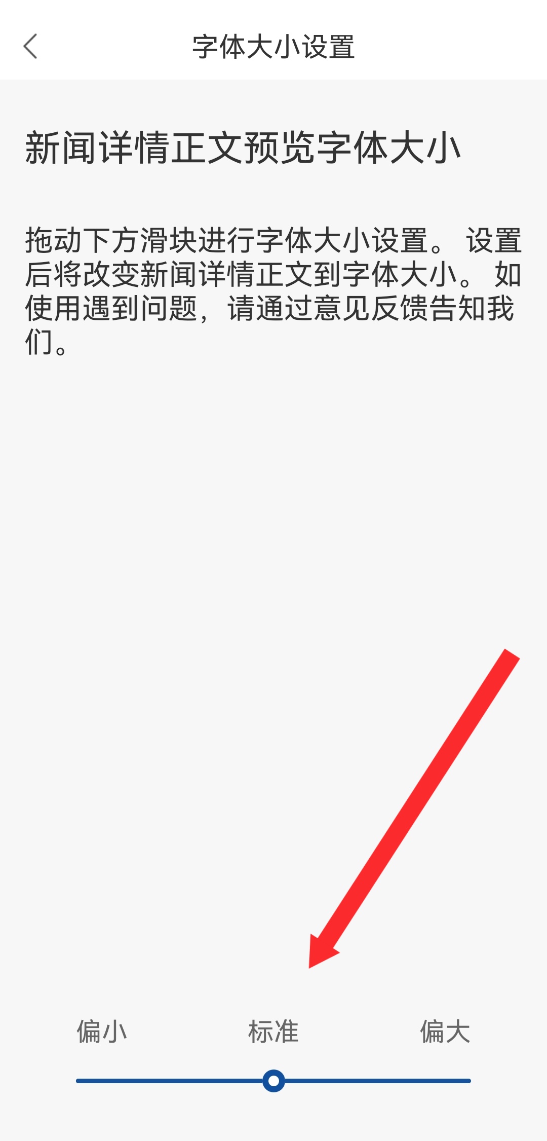 4、在字體大小設(shè)置頁面,拖動(dòng)滑塊調(diào)整字體大小,完成設(shè)置。